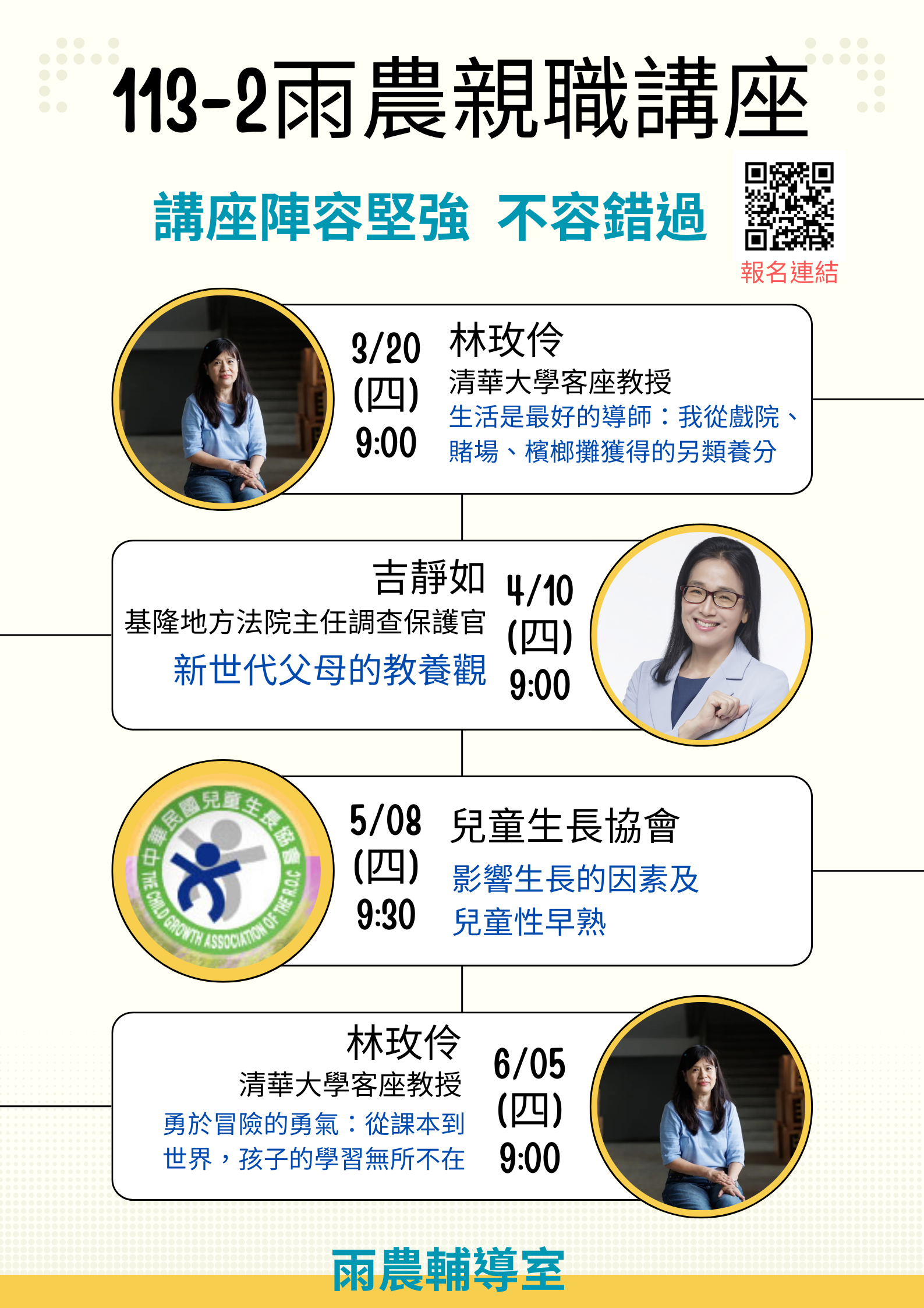 (二)4/10(四)9:00-11:30 吉靜如主任調查保護官,講題: 「新世代父母的教養觀」。 (三)5/8(四)9:30-11:30 兒童生長協會,講題:「影響生長的 因素及兒童性早熟」。 (四)6/5(四)9:00-11:30 林玫伶清大客座教授講題:「勇於冒 險的勇氣:從課本到世界,孩子的學習無所不在」。