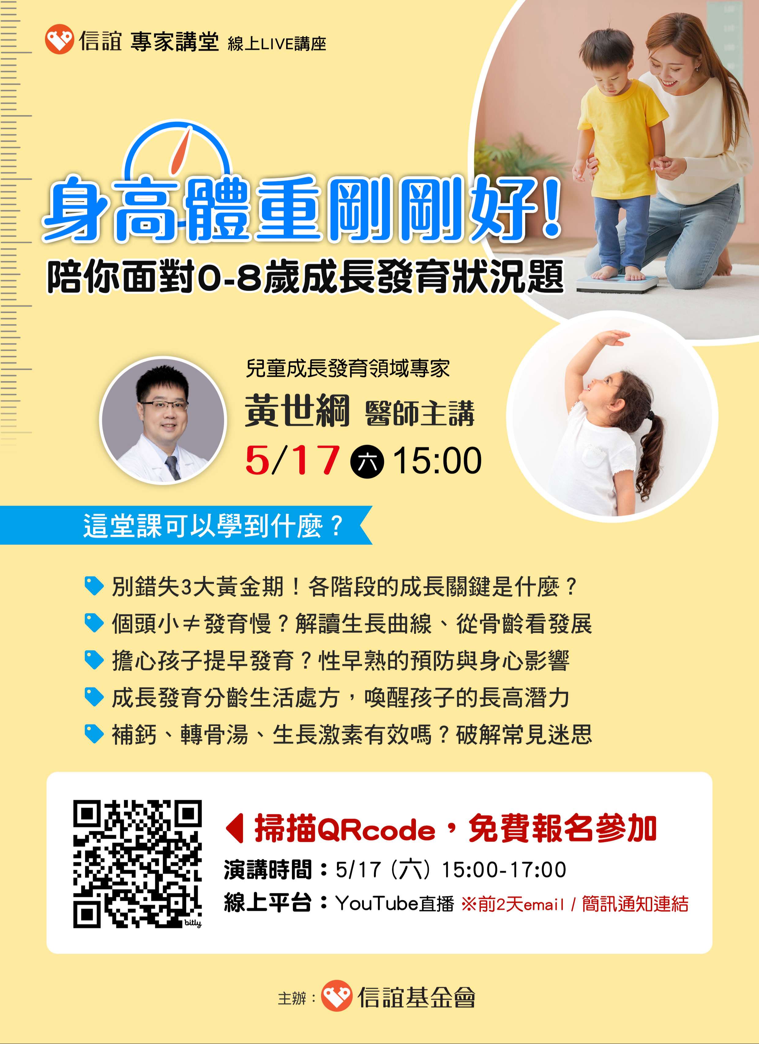 一、先養胖,才會抽高?擔心孩子比同齡孩子矮?何時該帶孩 子檢查骨齡?成長發育大小事,往往是家長疑惑與焦慮的 來源。唯有建立正確觀念、破解迷思,才能提早為不同階 段的發育,做好最關鍵的準備。信誼專家講堂將於2025年5 月17日(六)下午3:00-5:00舉辦【身高體重剛剛好!陪 你面對0-8歲成長發育狀況題】線上LIVE講座,邀請爸媽免 費報名參加。