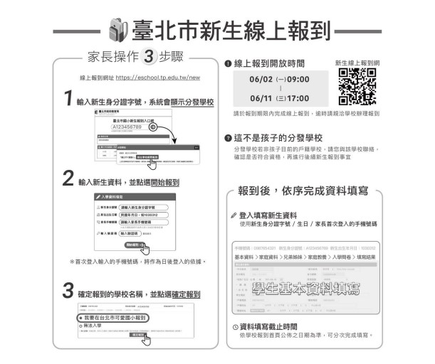 註:新生報到日期截止為6/11,資料填報期限為7/25,家長報到後都可再登錄修改。