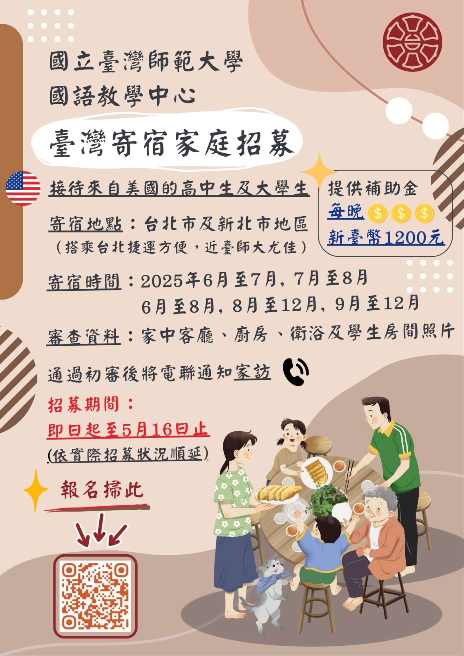 二、為促進美國高中生及大學生於在臺學習期間與當地臺灣人 進行文化交流、培養日常生活中運用華語的能力,顧特別 尋找對認識美國文化、並願意敞開家門的臺灣家庭,以提 供學員研習期間的寄宿接待,同時增進旨揭家庭與外國學 生認識不同風俗習慣與文化機會。