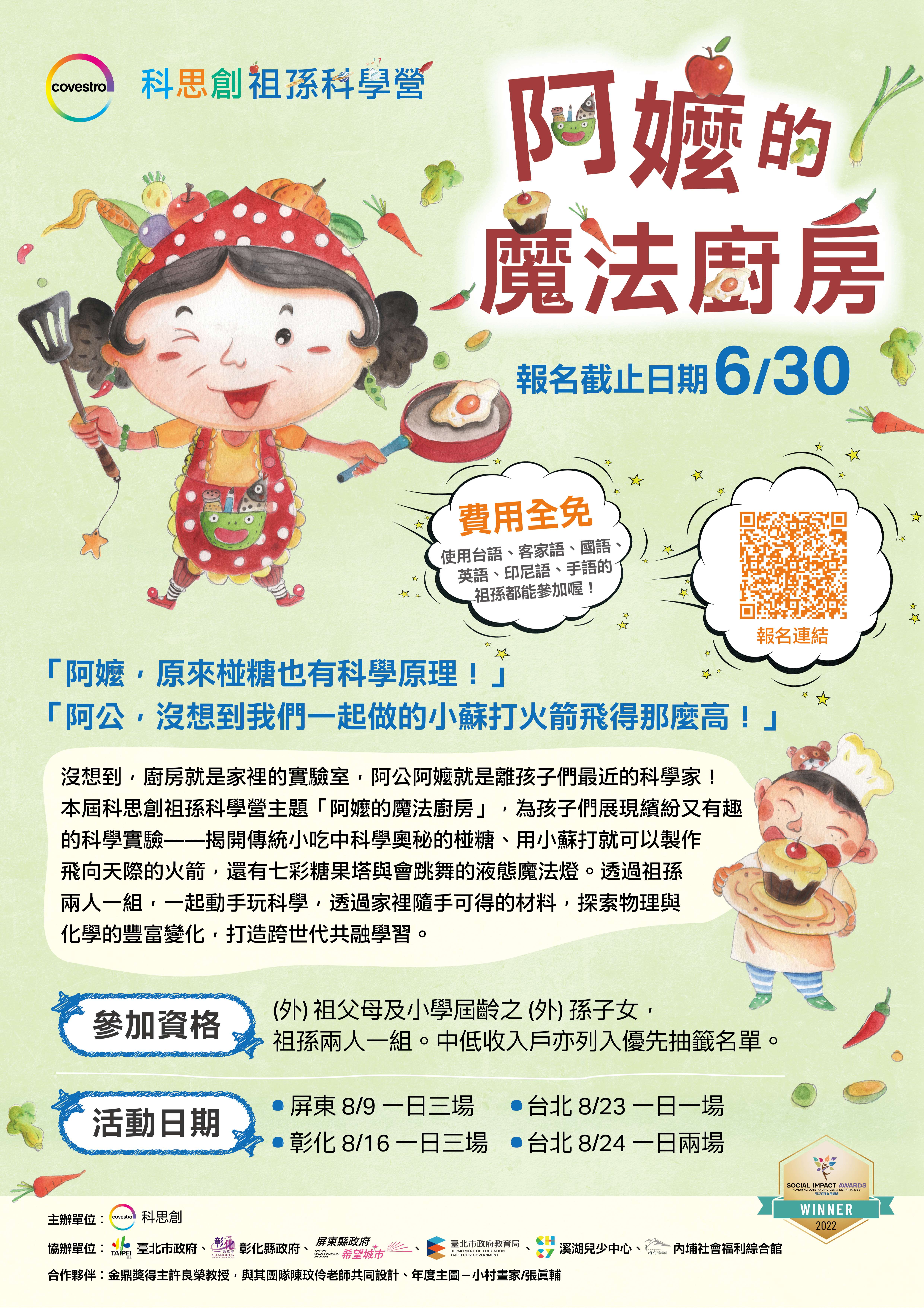 (四)參加對象:祖父母及小學屆齡之孫子女,祖孫2人一組 ,每場次最多18組。 (五)報名方式:即日起至114年6月30日前,逕至線上表單 (https://forms.office.com/e/j20vH3YJAY)填表報 名。 三、本案如有相關問題,請逕洽該公司企業溝通處,電話:02- 87262609,電子郵件:covestro-taiwan-comms@ covestro.com。