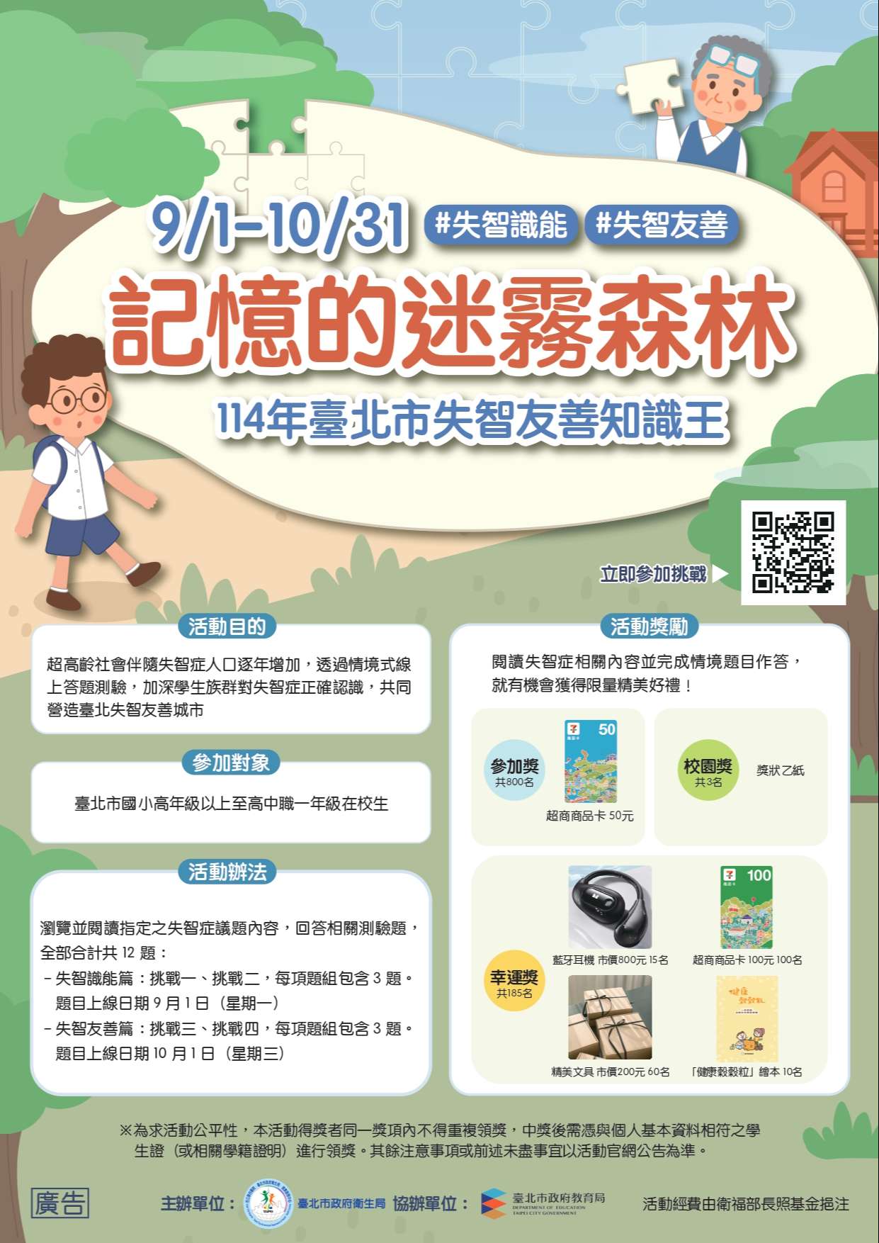 說明: 一、超高齡社會伴隨失智症人口逐年增加,衛生局局辦理旨揭活 動,透過情境式線上答題測驗,加深學生族群對失智症認 識,共同營造失智友善環境,活動資訊摘述如下: