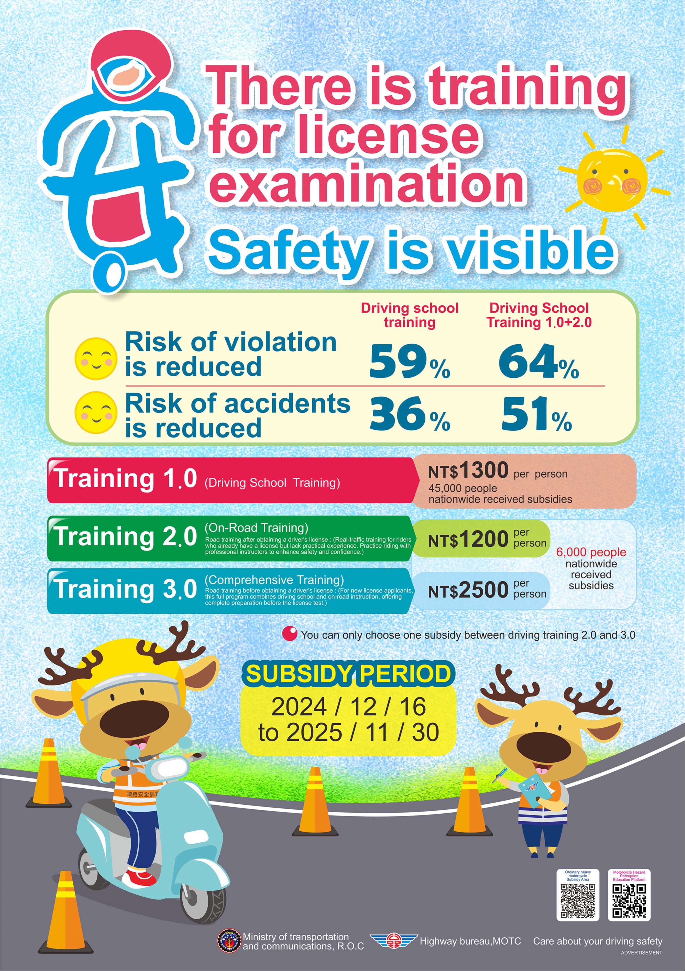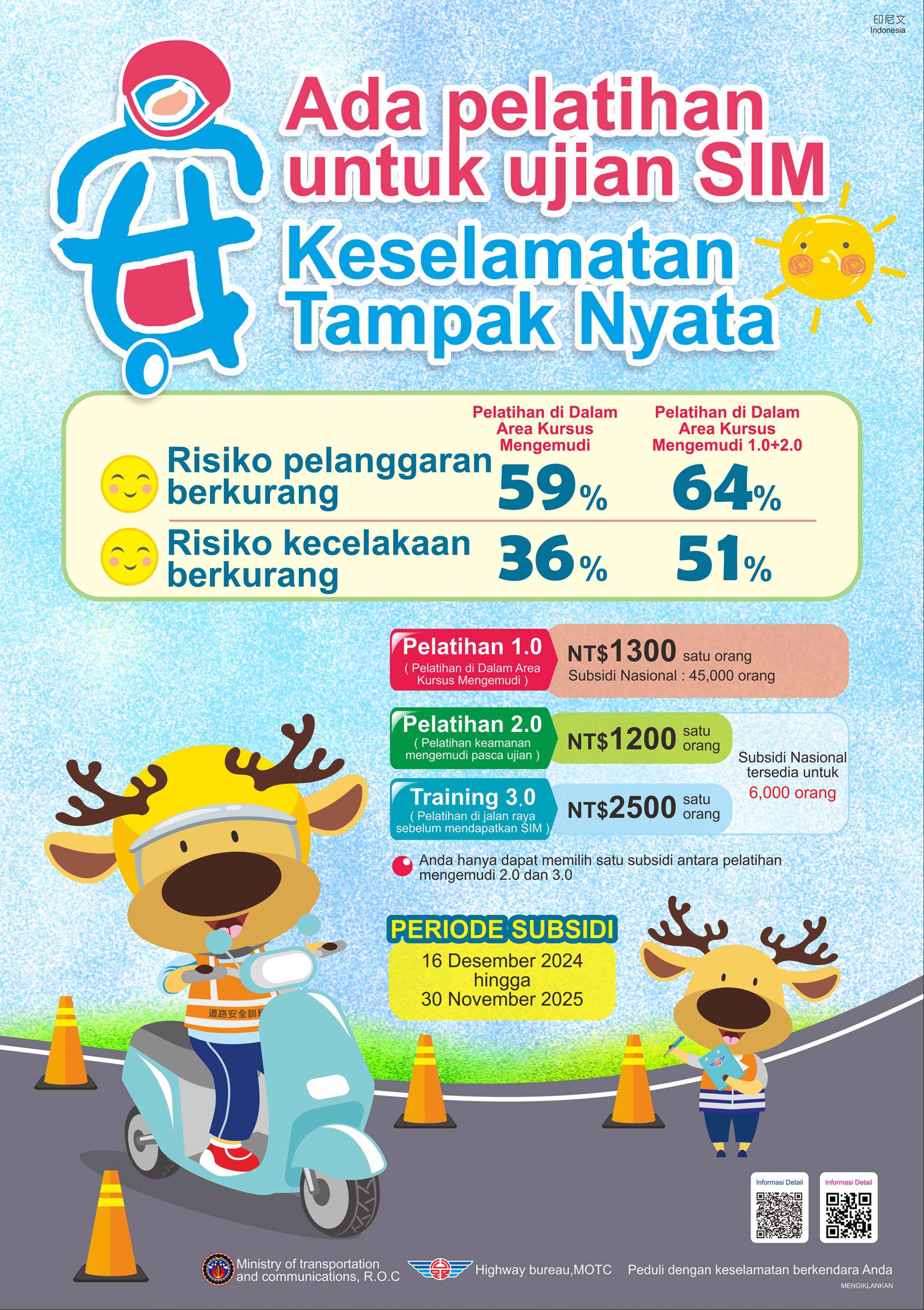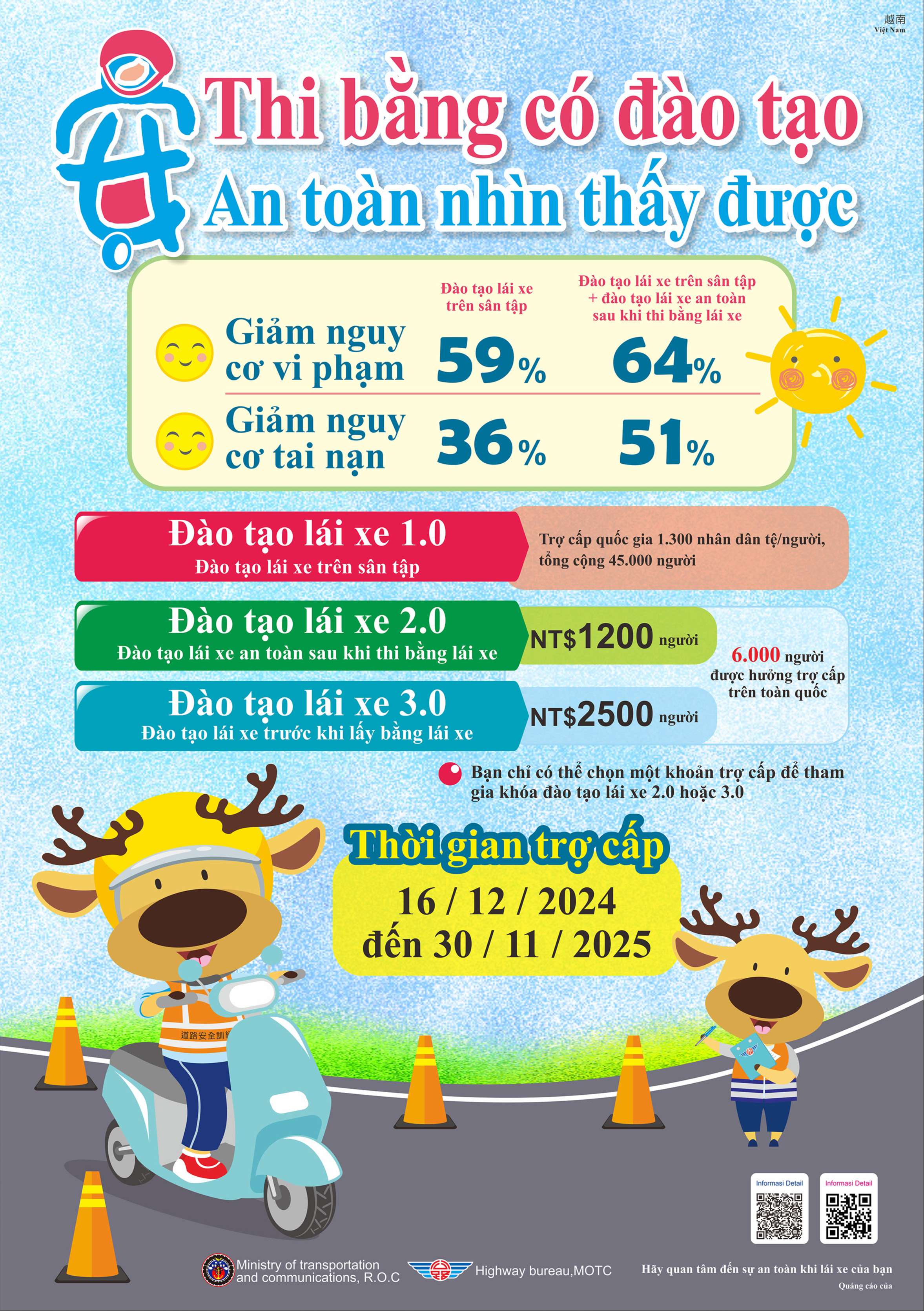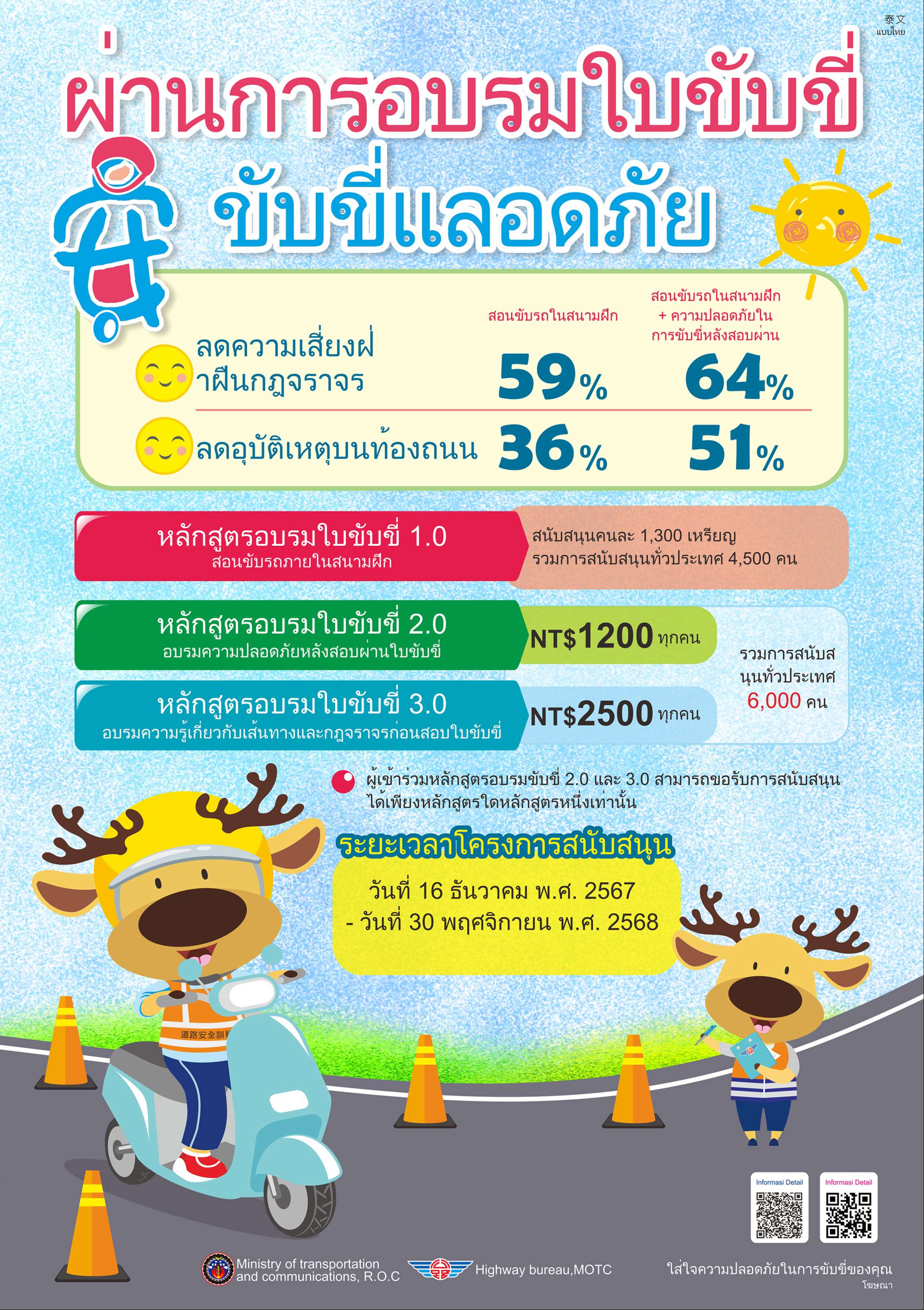 三、為強化學生機車安全駕駛觀念,降低交通意外之風險,鼓勵外籍生參加機車駕訓班,建立正確駕駛觀念與培養道路駕駛能力。