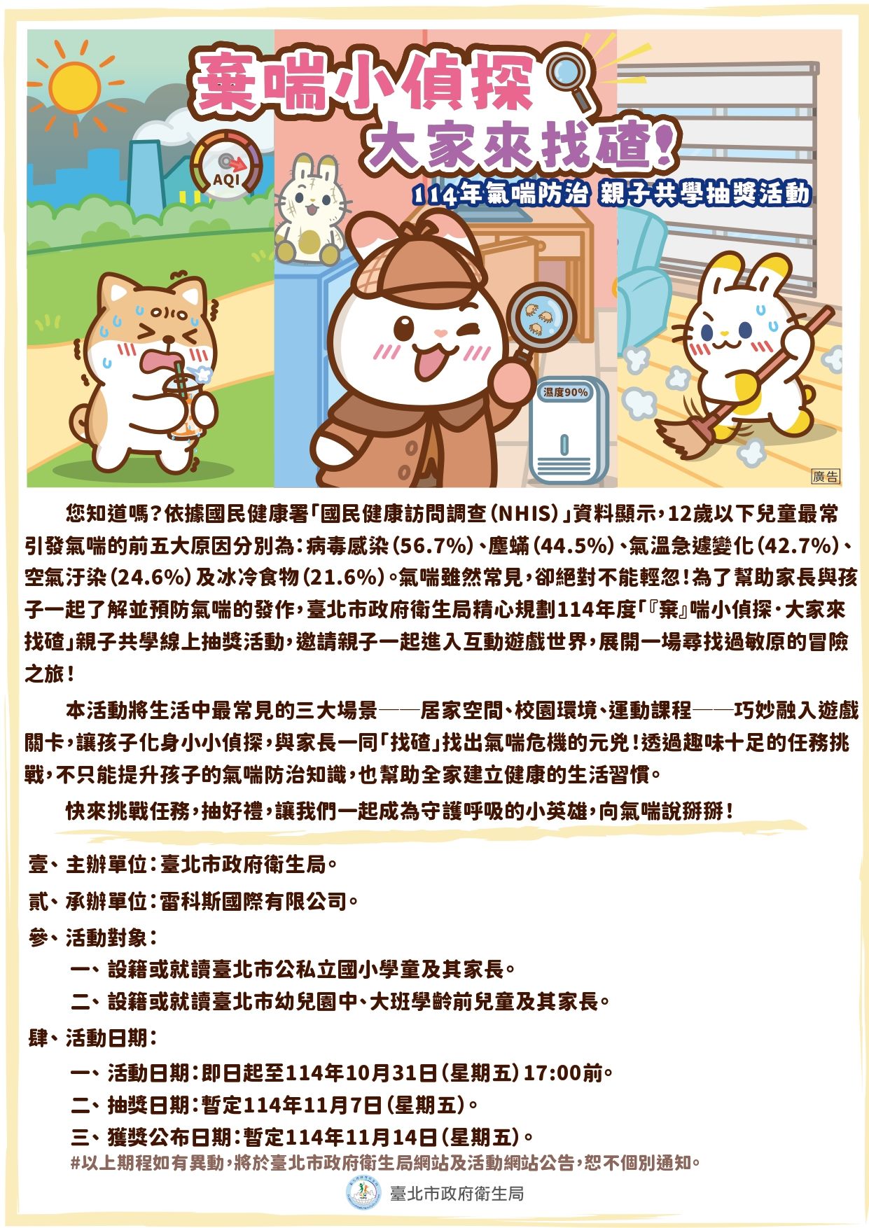 (二)參加方式:即日起至114年10月31日17時止,於活動網站 (網址:http://kideyecare.health.gov.tw /act_game)完成氣喘防治線上遊戲闖關,並填寫個人資 料即可參加抽獎。