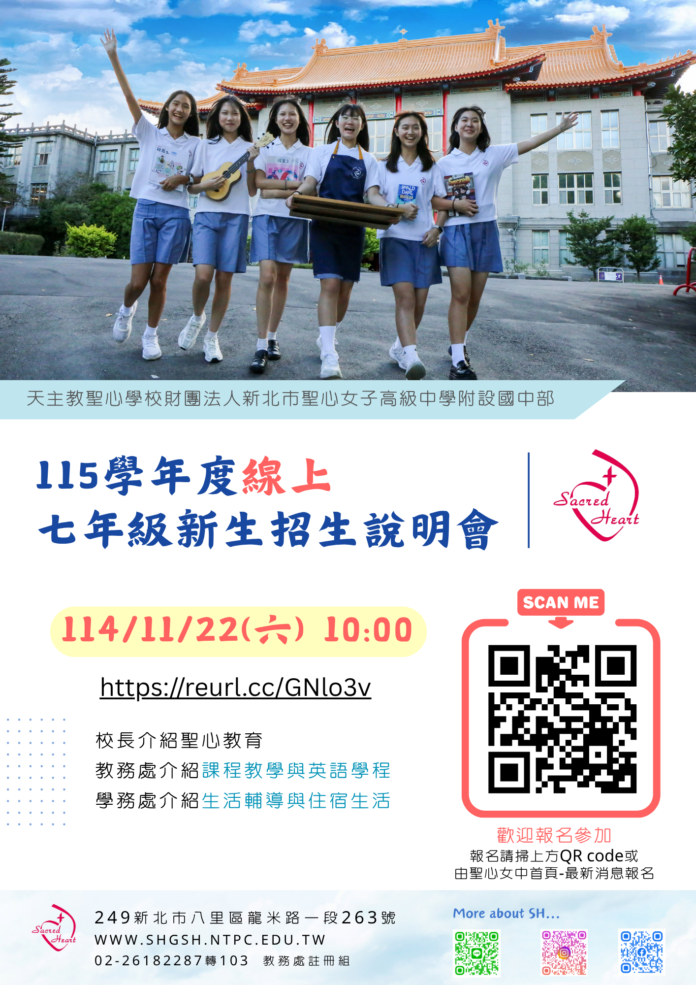 (二) 聖心女中首頁www.shgsh.ntpc.edu.tw —最新消息--115 學年度七年級新生線上招生說明會