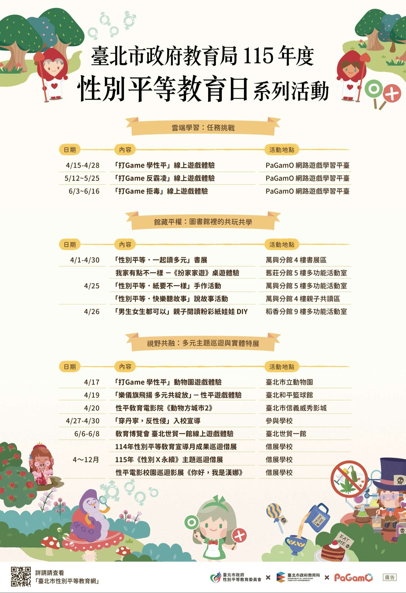 4、4月25日下午2時30分至4時,「性別平等.快樂聽故 事」說故事活動,萬興分館4樓多功能活動室。