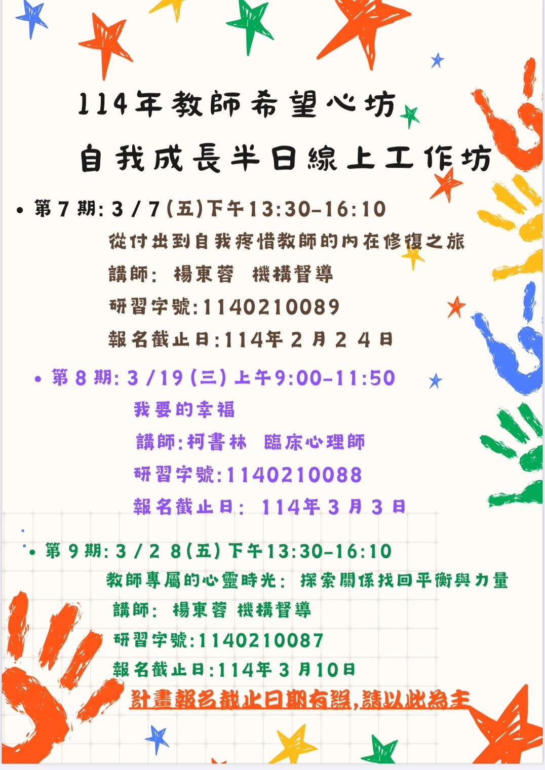 1、第7期:114年3月7日(星期五),下午13:30~16:10。